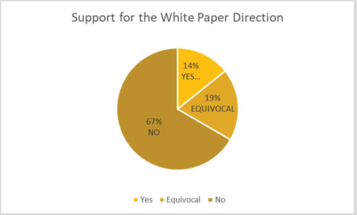 Across the 21 stakeholders identified by the APMA to be interviewed for this review, 14 (67%) entirely oppose the direction, the process, the results and the actions undertaken to implement the White Paper. Four (19%) are interested in the ideas but identify faults that make the White Paper inoperable. Only three (14%) support further pursuit of the White Paper intentions.
